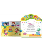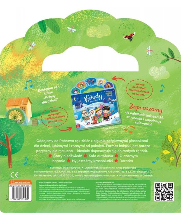 22,2 x 22,2 cm, ilustracje barwne, żłobienia i wycięcia w stronach oraz moduł dźwiękowy z 10 przyciskami wewnątrz książki - nagrania wierszyków i odgłosów zwierząt, uszlachetniona okładka