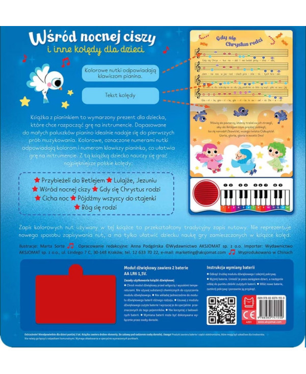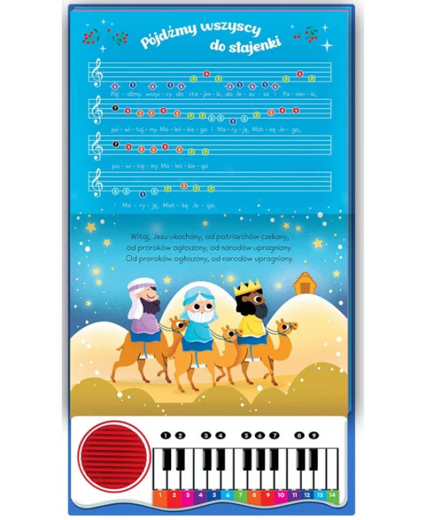 Siedem popularnych, znanych od pokoleń najpiękniejszych polskich kolęd, siedem uproszczonych zapisów nutowych oraz pianinko, na którym dziecko może zagrać wszystkie zamieszczone w książce utwory. Ta książka to nie tylko hołd w stronę tradycji śpiewania kolęd, ale i sposób na zachęcenie dziecka do nauki gry na instrumencie.