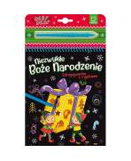 Użyj rysika jak magicznej różdżki, a na pokrytych czernią stronach wyczarujesz kolorowy czas Bożego Narodzenia. Czekają tu na ciebie: Święty Mikołaj z reniferem, bałwanek z wróbelkiem, elfy niosące prezent, świąteczna choinka, kotek i miś na sankach, zając na skuterze śnieżnym, aniołek grający na gitarze, królik w świątecznej skarpecie, liski na saneczkach oraz królewna na łyżwach na lodowisku . Wyjmij rysik z opakowania i delikatnie zdrapuj nim czarną farbę. Zabawa z książką będzie jeszcze ciekawsza, jeśli wymyślisz wzory i ozdobisz nimi rysunki – mogą to być paski, kółka, kreski, zygzaki, a także śnieżynki, wstążeczki, serpentyny. Zamieszczone krótkie zabawne wierszyki do każdego rysunku mogą być pierwszymi czytankami dla początkujących czytelników, a z pewnością przybliżą naszych bohaterów.
