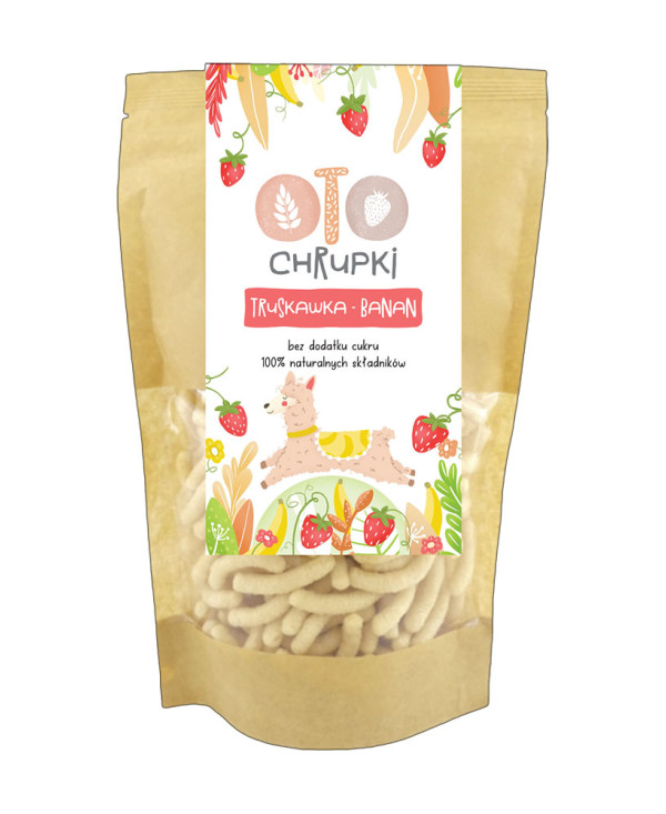 Chrupki Truskawka - Banan (Orkiszowe pełnoziarniste, orkisz z upraw ekologicznych) — OTO Chrupki powstały na bazie prostych składników: pełnoziarnistego orkiszu z certyfikowanych upraw ekologicznych, ryżu i owoców – liofilizowanej truskawki i suszonych bananów, które nadają im delikatny, owocowy smak oraz apetyczny kolor.
