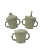 Kubek silikonowy z wkładem ze stali nierdzewnej i trzema nakładkami: ustnik, słomka, niewysypek.