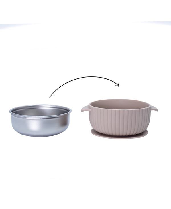 Miseczka silikonowa z przyssawką i wkładem ze stali nierdzewnej.