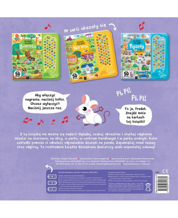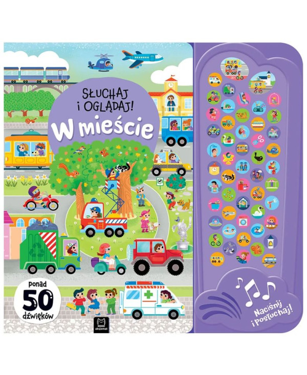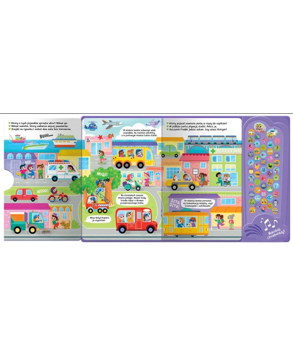 Pięć bogato ilustrowanych rozkładówek ze zwierzętami, pojazdami i ciekawymi miejscami w mieście: na starówce, w parku, na ulicy, w centrum handlowym i w parku wodnym. Oglądaj ilustracje, a potem odpowiadaj na zadane pytania, szukaj wskazanych zwierzaków, pojazdów i innych elementów ilustracji, a przede wszystkim słuchaj ponad 50. odgłosów. Kolor zakładki pomoże ci odnaleźć odpowiednie dźwięki na panelu. Aby włączyć nagranie, naciśnij kółko. Chcesz wyłączyć? Naciśnij kółko jeszcze raz. Zapamiętaj nazwy pojazdów i dźwięki ich silników, a także nazwy zwierząt oraz przedmiotów i urządzeń, które można spotkać w mieście, i wydawane przez nie odgłosy.