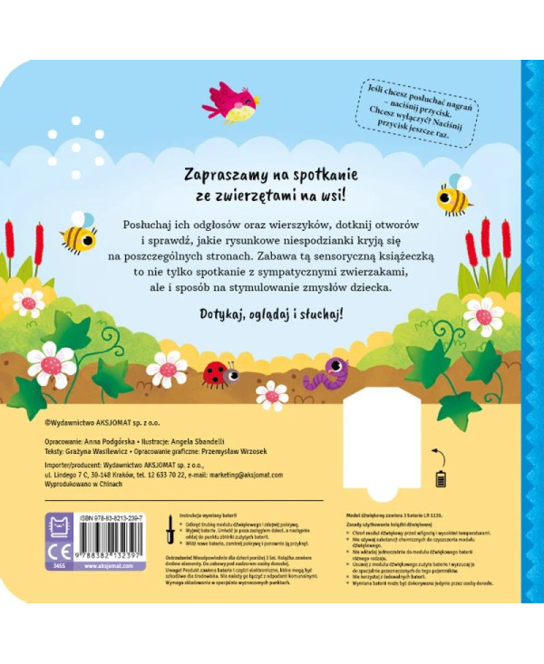 OSTRZEŻENIE! Nieodpowiednie dla dzieci poniżej 3 lat. Książka zawiera drobne elementy. Do zabawy pod nadzorem osoby dorosłej. Uwaga! Produkt zawiera baterie i części elektroniczne, które mogą być szkodliwe dla środowiska. Nie należy go łączyć z odpadami komunalnymi. Wymaga składowania w specjalnie wyznaczonych punktach.